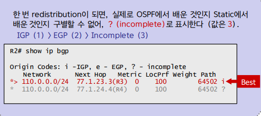 -IGP나 EGP가 아닌 방법으로 BGP에 포함된 것을 의미하며 보통 BGP로 재분배된 네트워크를 의미함