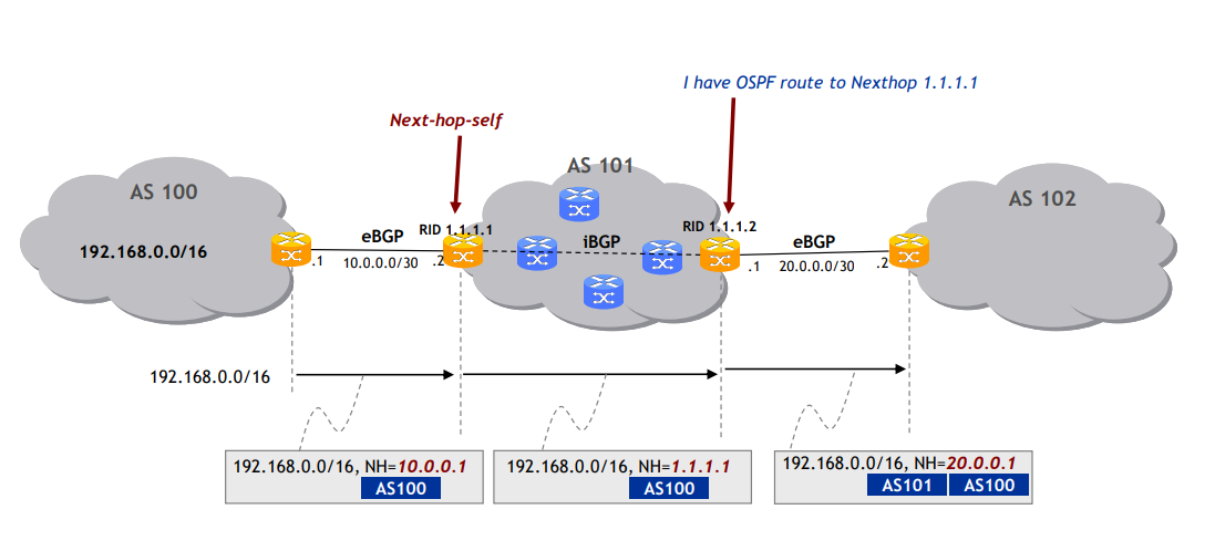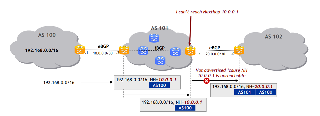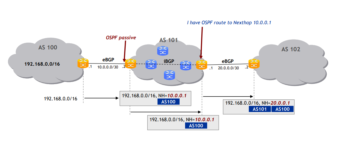 ---> AS100~AS101 간의 physical link의 address가 AS101 내에서 OSPF로 advertise 되지 않은 경우임